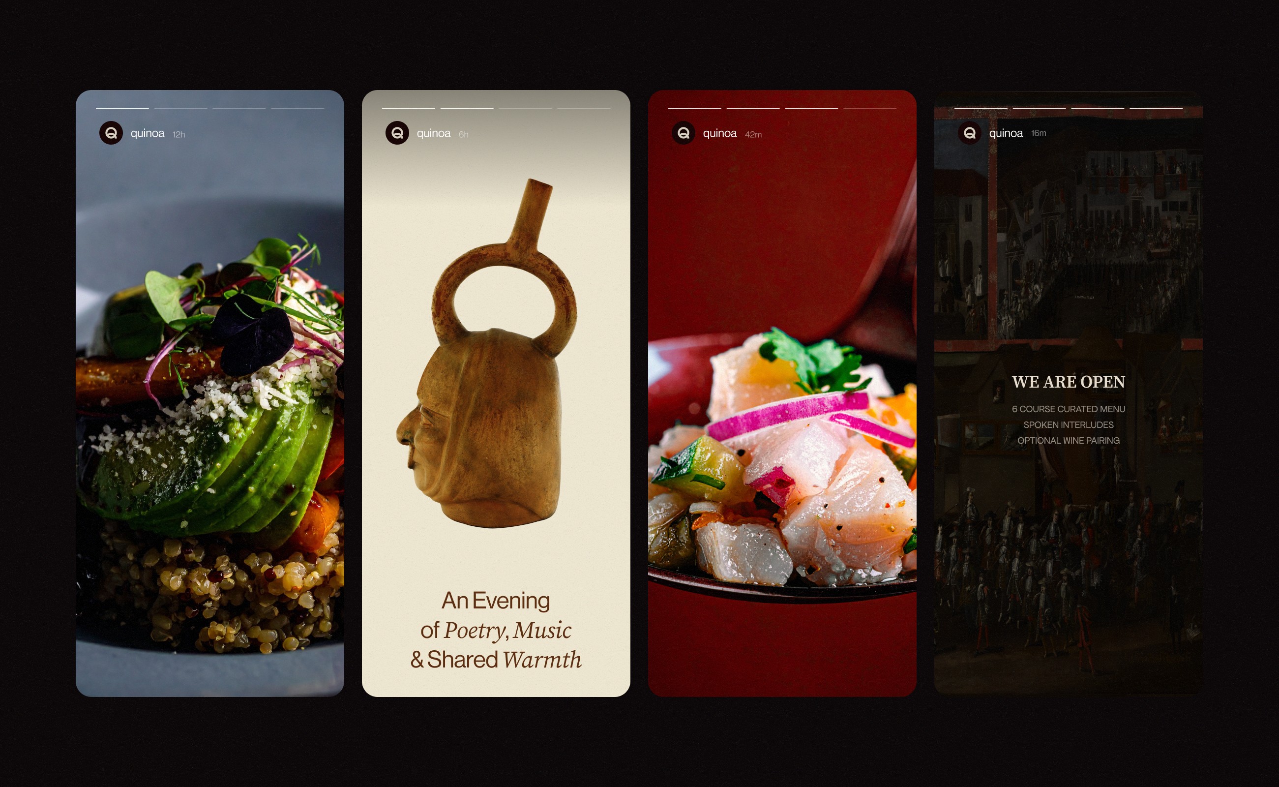 Quinoa® nasce da fusão entre a sofisticação contemporânea e a tradição andina. A proposta visual é aqui pensada para celebrar a culinária tradicional, o bom gosto, os Andes e a elegância.
